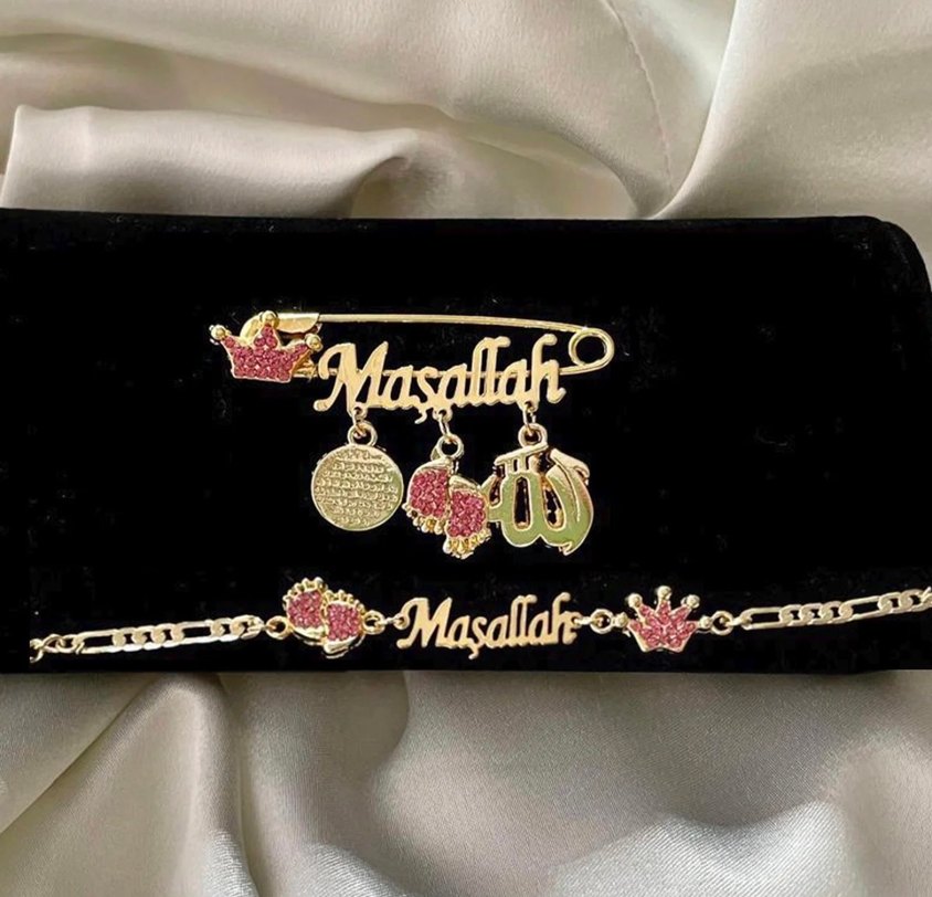Zincir detaylı, altın renkli 'Maşallah' yazılı broş. Çiçek ve taç figürleriyle süslenmiş, düğünlerde kullanılabilir.