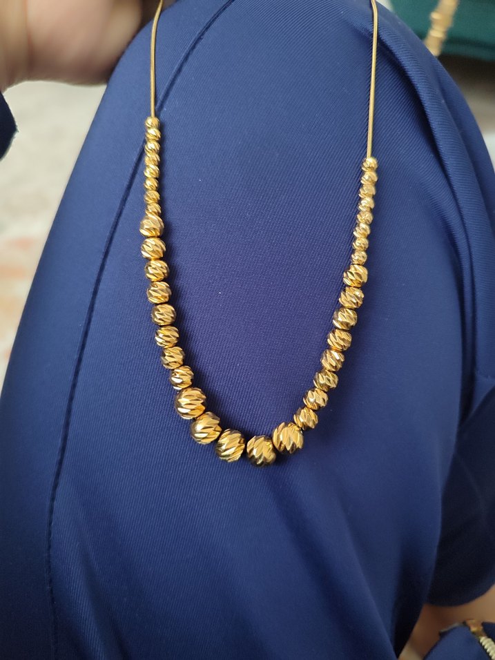 Zincir detaylı, desenli boncuklardan oluşan altın renkli midi uzunlukta kadın kolye, günlük şık kullanım için uygundur. ✨