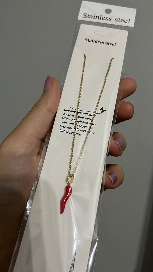 Paslanmaz çelikten altın renkli zincir kolye, kırmızı biber figürlü. Ambalajda baskılı ilham verici mesaj bulunur. Minimalist ve günlük sokak stili için uygun. ️