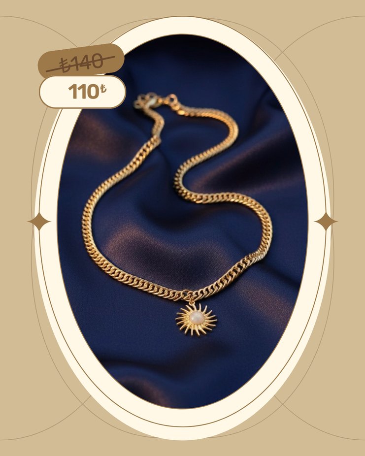 Parlak altın renkli, zincir detaylı ve güneş figürlü midi uzunlukta kolye. Günlük sokak stiline uygun şık aksesuar. ☀️