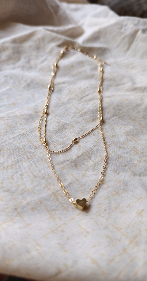Altın renginde, zincir detaylı ve küçük kalp figürlü, günlük kullanıma uygun parlak minimalist bohem stilde midi kolye.
