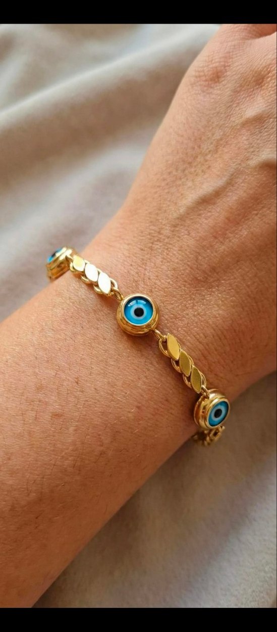 Zincir detaylı, altın renkli bileklik üzerinde mavi nazar boncukları bulunur. Bohem ve retro tarzlara uygun, günlük kullanıma uygundur. 316 L çeliktir. Kararma yapmaz. Antialerjeniktir. Denizde ve havuzda rahatlıkla kullanabilirsiniz