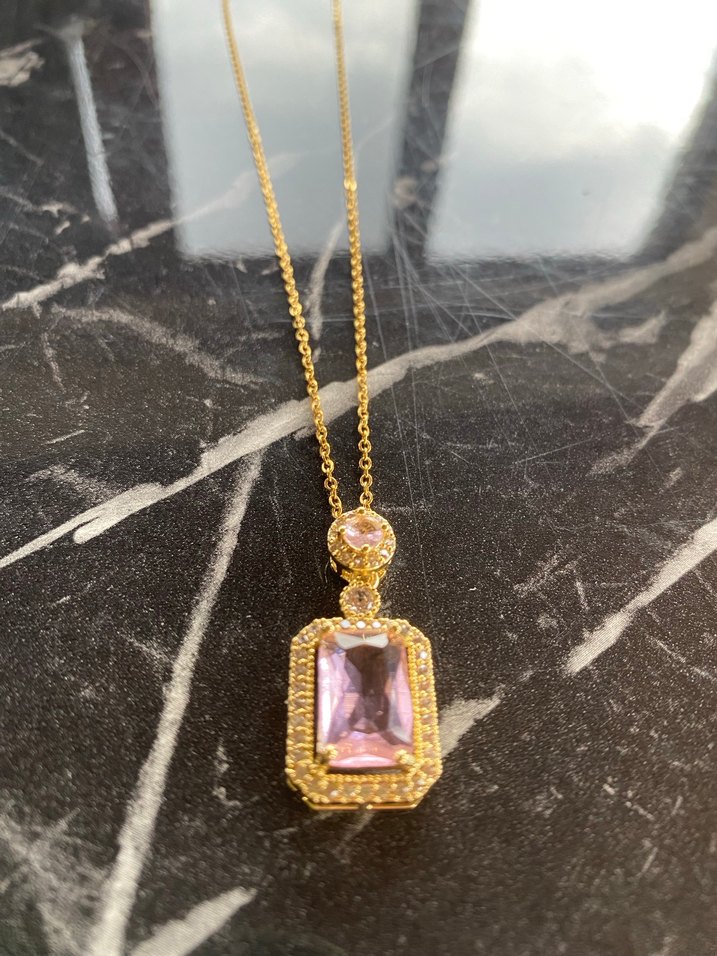 Zincir detaylı, altın renkli uzun kolye, dikdörtgen pembe taşlı ucu ile romantik akşamlar için uygundur. ✨
