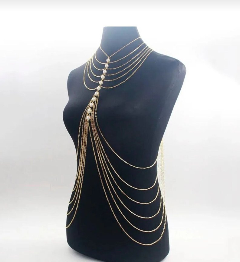 Parlak altın renkte, yılan deseni detaylı çok katlı zincirlerden oluşan, cesur bohem tarzda günlük kullanıma uygun vücut zinciri. ✨
