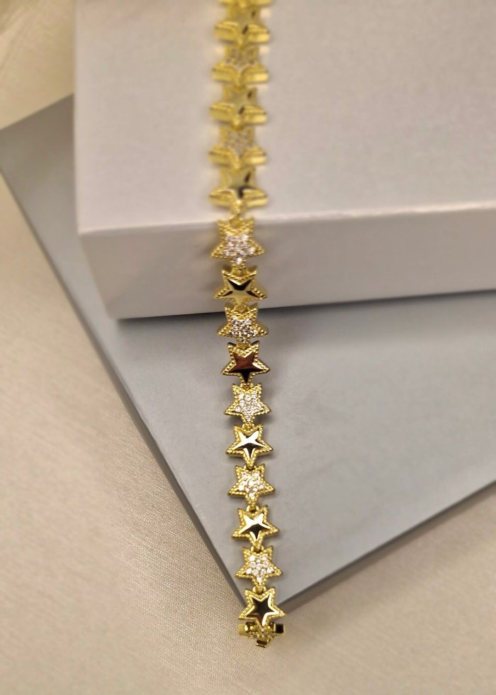 Zincir detaylı, altın renkli ve işlemeli yıldız desenli çağdaş kadın bileklik. Renkli ve gösterişli tarzıyla düğünler için uygun, sade bir tasarım. ✨