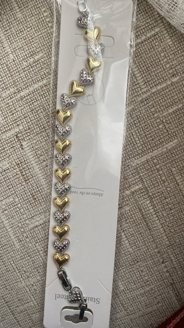 Altın ve gri kalp şekilli bağlantılardan oluşan zincir detaylı bileklik, bohem tarzıyla rahat bir görünüm sunar.