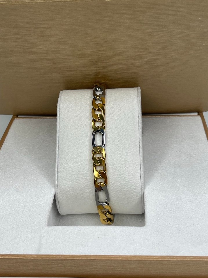 Günlük kullanıma ve iş hayatına uygun, altın ve gümüş tonlarda zincir detaylı,desen içermeyen minimalist çelik erkek bilekliği. ✨ Komple birbirine geçmeli ortaları boşluk 3 adeti gold oval,6 adeti uzun gümüş U şeklinde çelik gümüş renk parçalardan oluşan,alt kısmı papağan klipsle açılıp kapanabilen gümüş ve gold renk çelik şık erkek bileklik. Genişlik:20,5 CM Eni:0,7 MM