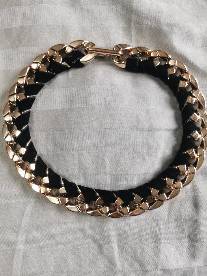 Zincir detaylı, siyah yılan desenli altın renk midi kolye, rock punk tarz için uygun.