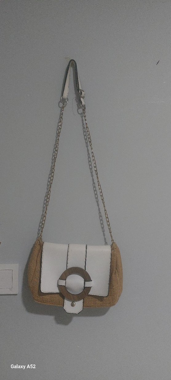 Bej deri kadın çanta, zincir askı ve yuvarlak tokasıyla minimal ve bohem tarzı günlük kullanıma uygundur.