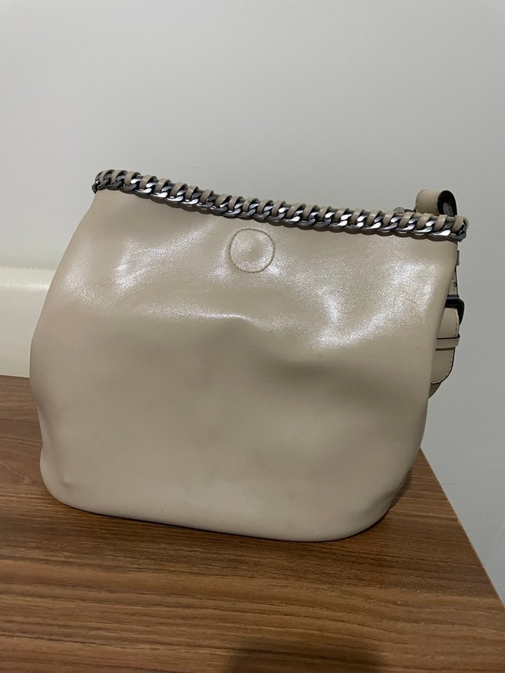 Bej deri kadın çantası, zincir detaylı, çağdaş ve modaya uygun tasarım. Günlük kullanım için uygun, desensiz şık görünümle.