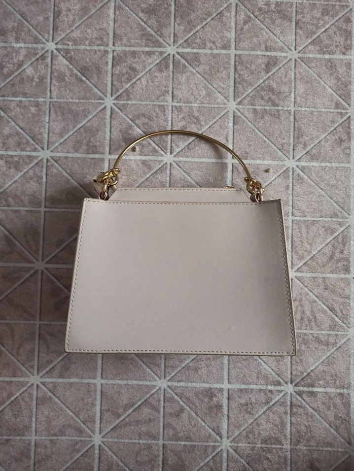 Bej deri ve zincir detaylı, modern klasik tarzda, günlük kullanıma uygun kadın çantası.