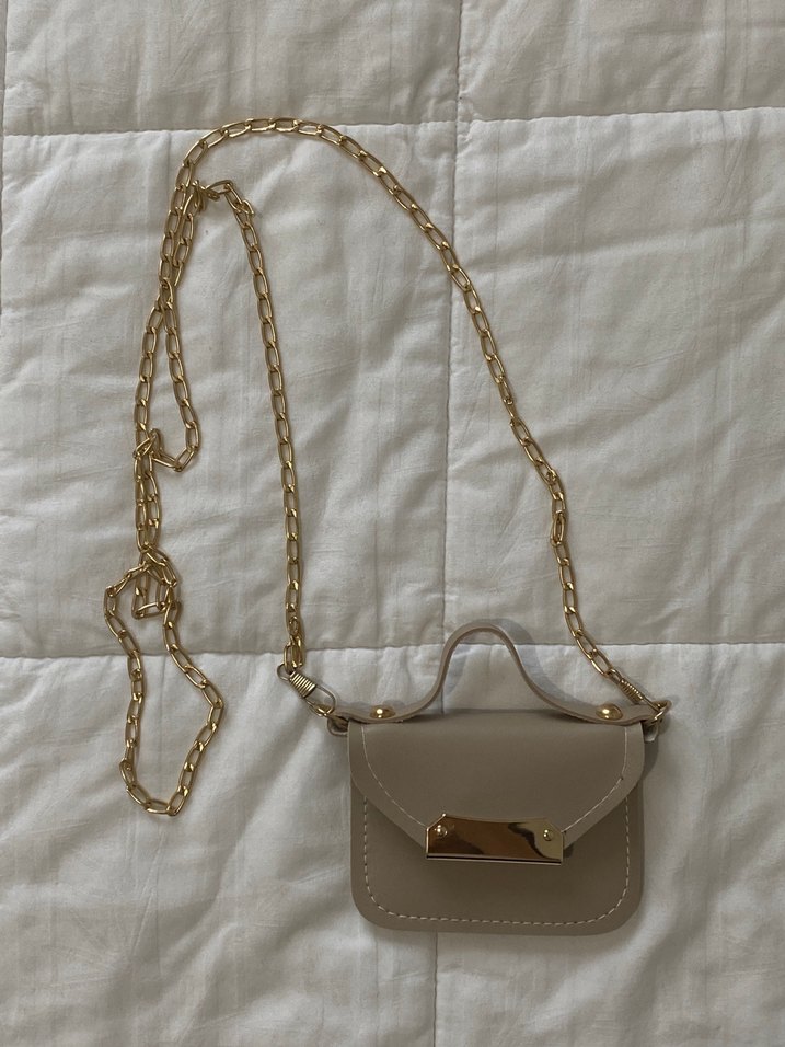 Zincir detaylı bej deri kadın çantası, küçük saplı ve altın renkli zinciri çıkartılabilir