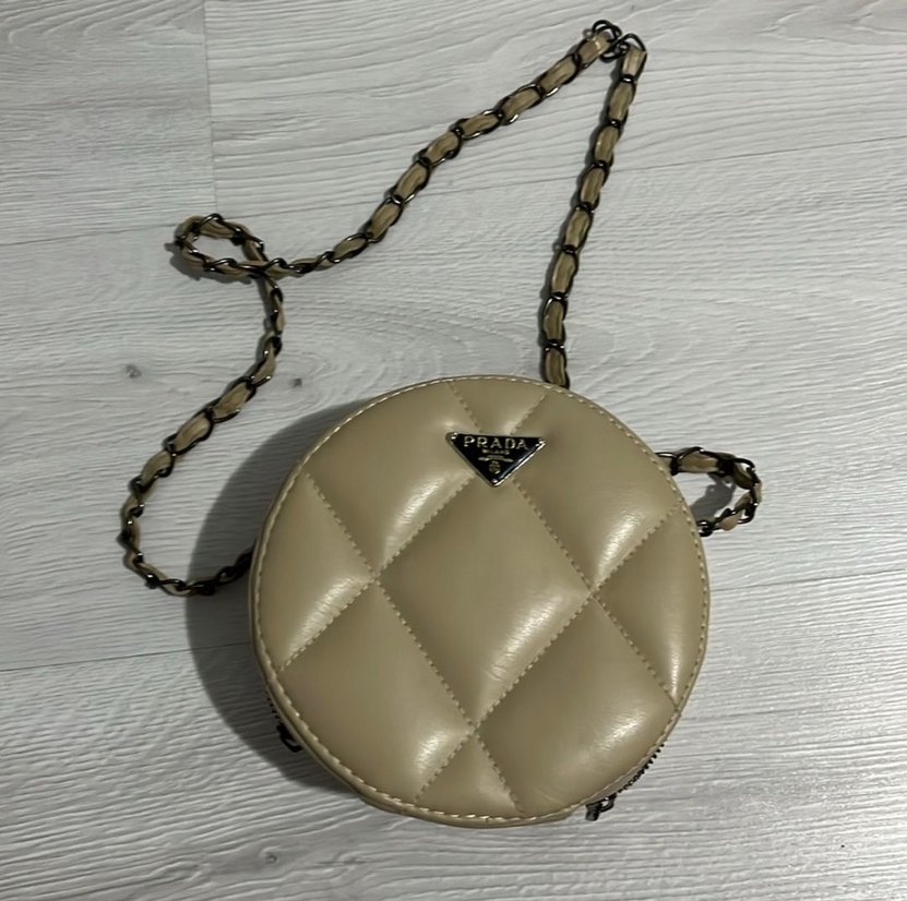 Zincir detaylı, yuvarlak kapitone desenli bej deri kadın çanta. Gri yılan derisi deseni ve trend sokak stili ile dikkat çekiyor.