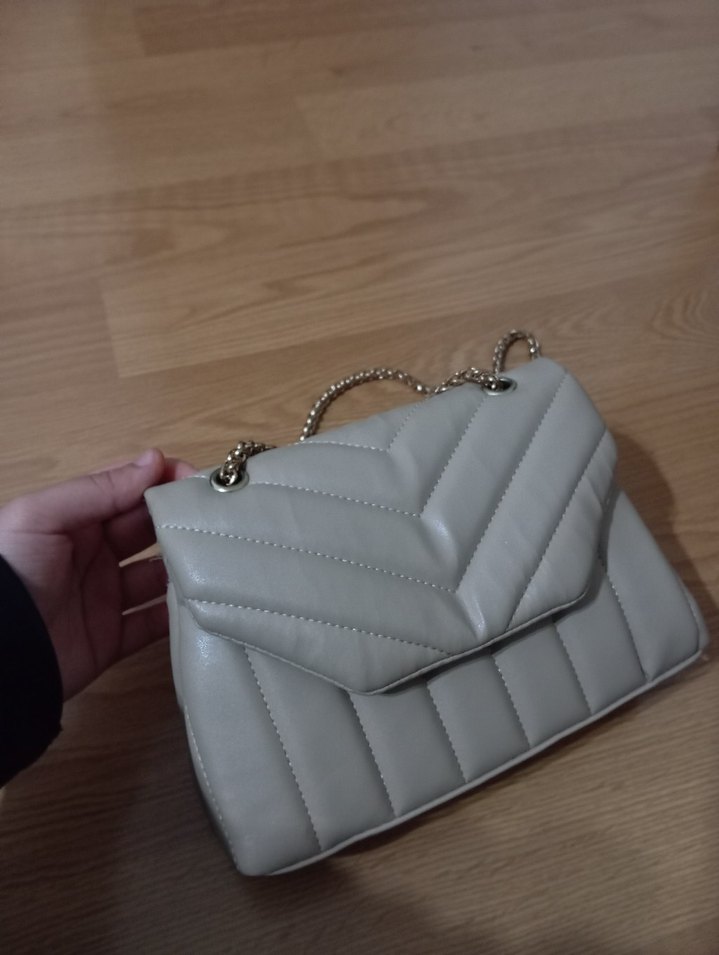Bej renkte, zincir detaylı deri kadın çantası, modern klasik tarzda ve günlük kullanıma uygun, trend casual stil sunar. sadece ic fermuarin arkasında sökük var elle bile dikilebilir ben alırken fark etmedim