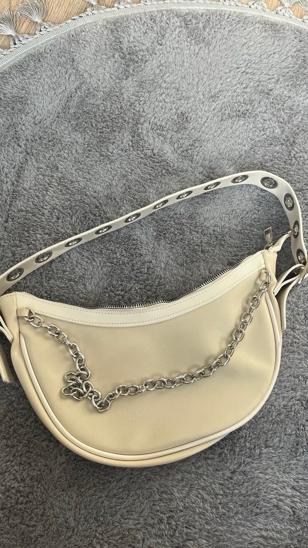 Bej deri, zincir detaylı kadın çantası. Paris sokak modasına uygun, günlük kullanıma elverişli, trend bir görünüm sunar.