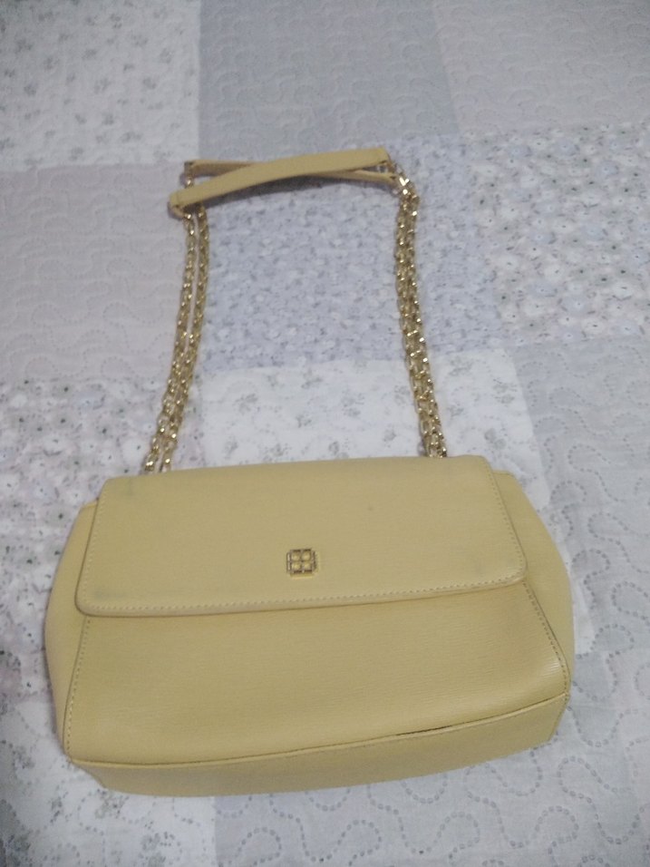 Zincir detaylı, bej renkli deri kadın çantası. Modern klasik tarzda, desensiz ve günlük kullanıma uygun.