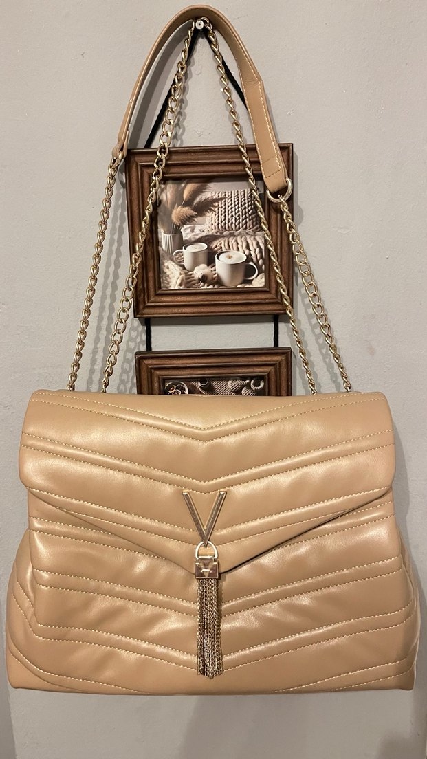 Zincir detaylı, parlak bej deri kadın çantası. Günlük kullanıma uygun çağdaş tarzda, klasik zarafeti yansıtıyor.