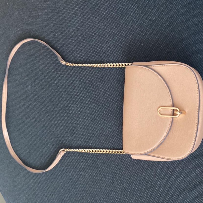 Zincir detaylı, bej renkli deri kadın çantası, günlük kullanıma uygun çağdaş ve desen içermeyen tasarıma sahiptir. Pastel tonu trendi günlük tarzlara uyar.