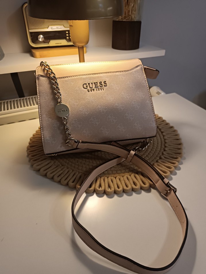 Pudra renkte, zincir detaylı ve baskılı desenli deri kadın çantası. GUESS logosu bulunur, günlük kullanıma ve klasik şıklığa uygundur.