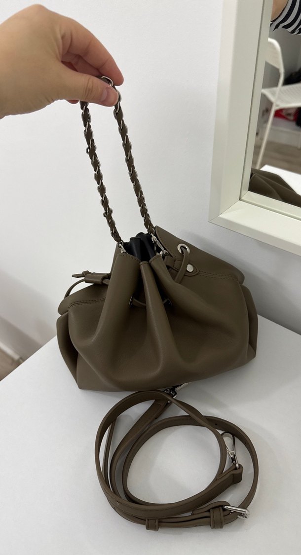 Zincir detaylı bej deri kadın çanta, minimalist tasarıma sahip. Yumuşak yüzeyli, desen içermeyen ve çıkarılabilir askılıdır. HİÇ KULLANILMADI