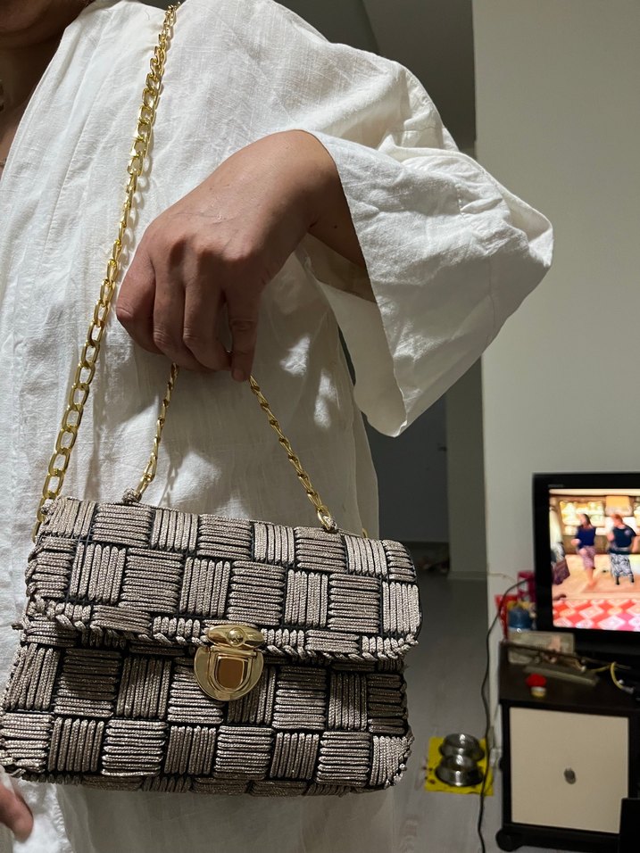 El emeği, desenli ve zincir detaylı bej kadın çanta. Bohem ve Paris tarzını günlük kullanıma uygun şekilde birleştirir.