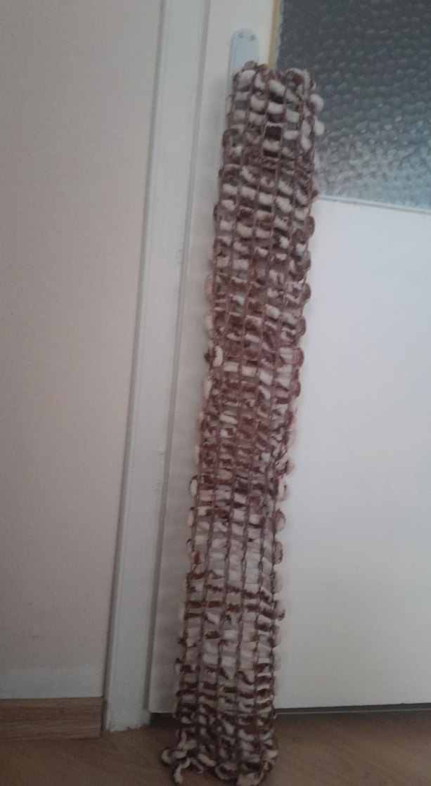 Zincir detaylı, bej ve gri tonlarda örgü kumaştan yapılmış, bohem tarzı yansıtan kadın atkısı.