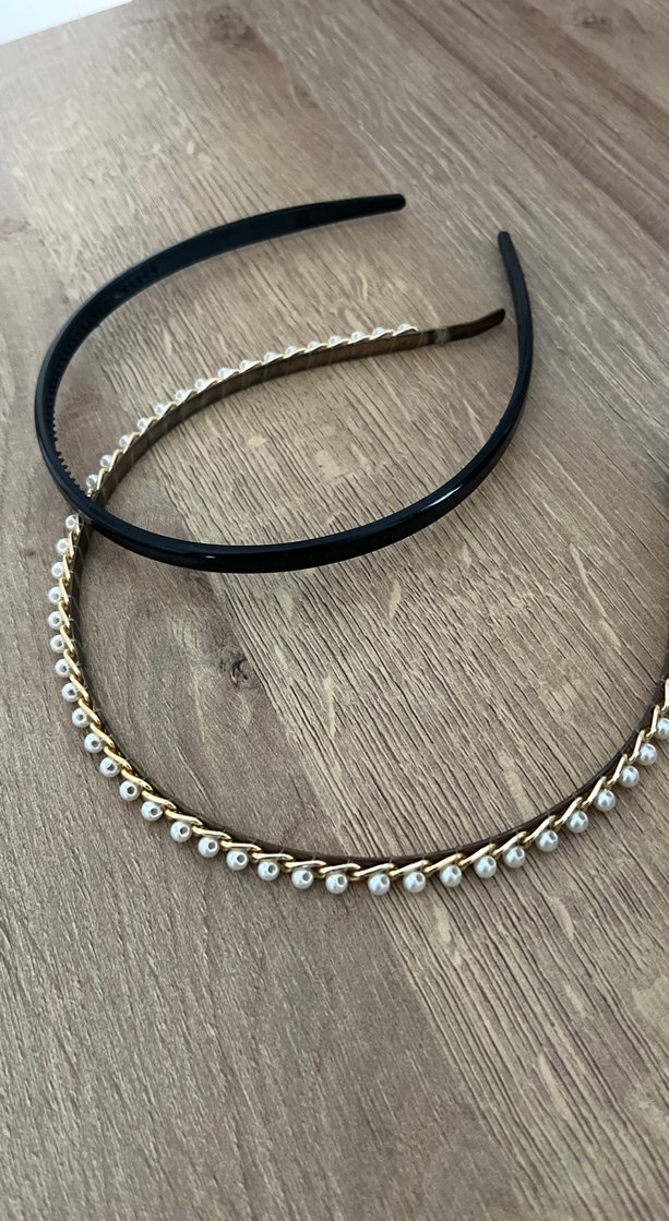 İnce zincir detaylı, parlak bej ve inci süslemeli iki saç bandı, minimal ve klasik şıklık için uygun.