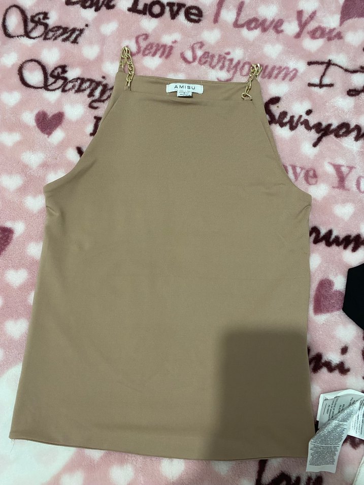 Bej renkli, zincir detaylı kadın atlet, vücuda oturan kesimi ve yumuşak sentetik kumaşıyla rahat bir günlük sokak stili sunar.