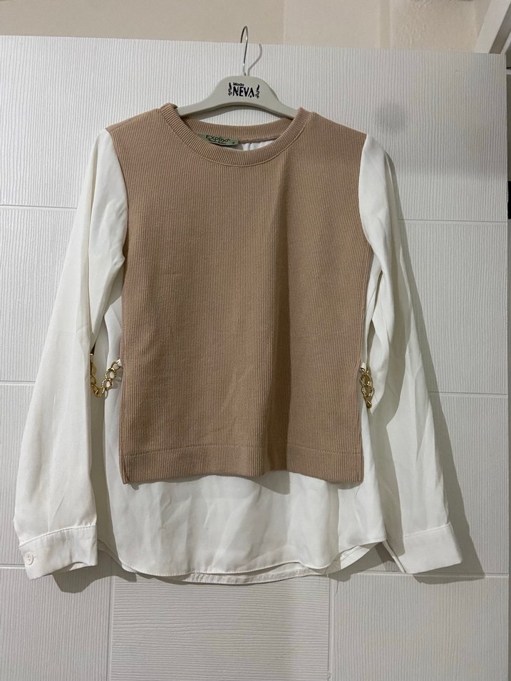 Uzun kollu, bisiklet yaka, zincir detaylı, sentetik kumaştan yapılmış, rahat kesim bej bluz. S -Mbeden rahatlıkla olur