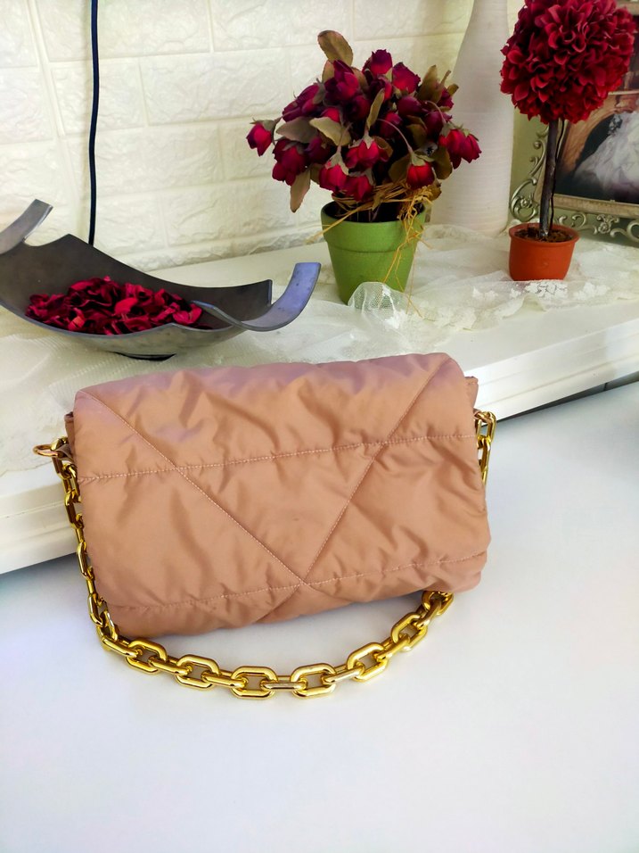 Yumuşak sentetik kumaştan yapılmış, zincir detaylı bej kadın çanta. Pastel tonu ve desensiz tasarımıyla trend sokak stiline uygundur.