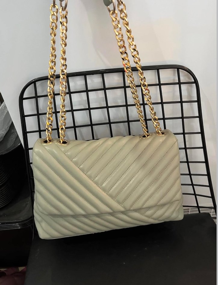 Çizgili bej deri ve altın renk zincir detaylı kadın çantası, modern klasik ve Paris tarzını yansıtıyor. Günlük kullanıma uygun.