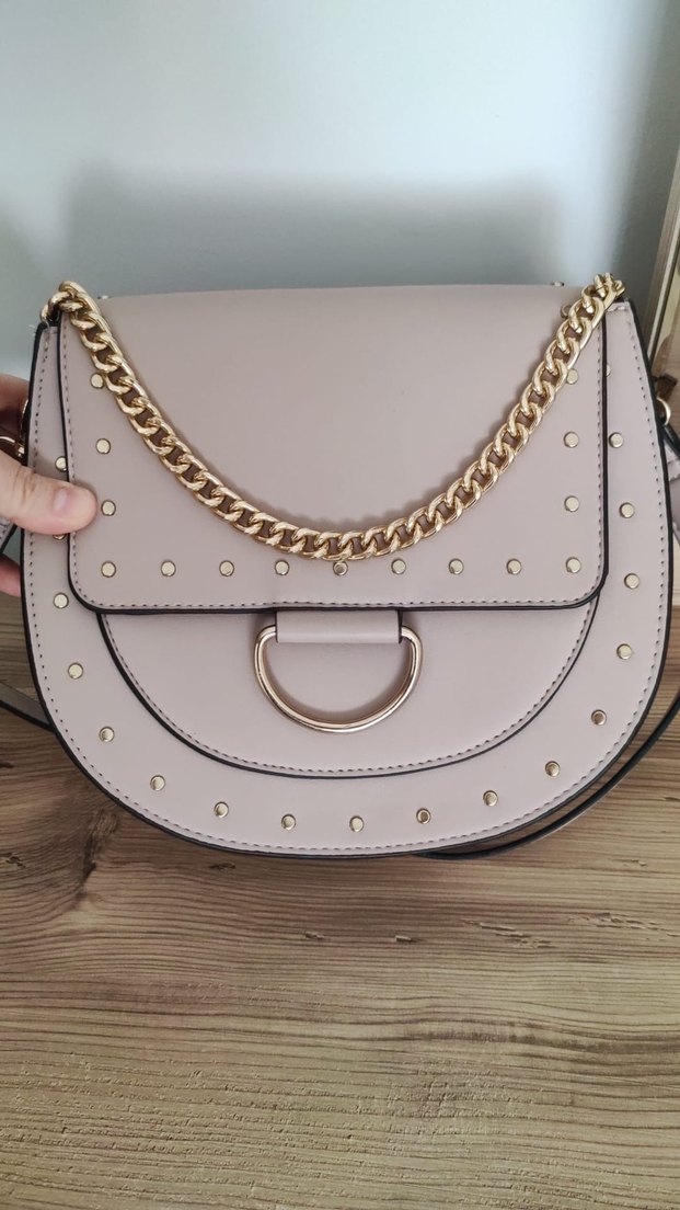 Bej deri çanta, zincir detaylı ve desenli, günlük kullanıma uygun çağdaş tarzda, trendi rahat Paris havası taşıyor.