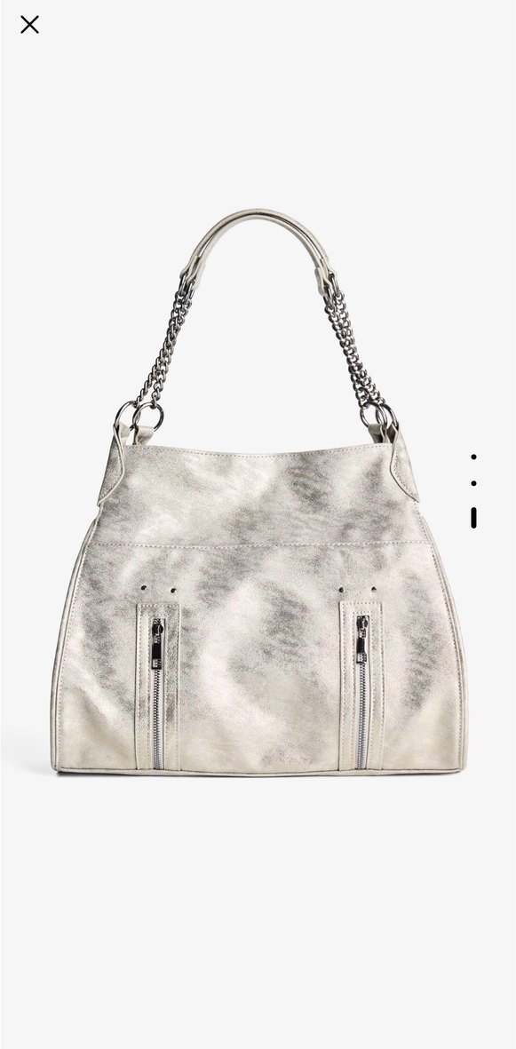 Parlak bej deri kadın çanta, zincir detaylı saplar ve önünde iki fermuarlı cep bulunur. Günlük kullanıma uygun, çağdaş Paris tarzı.
