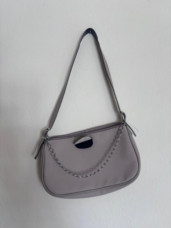 Bej deri kadın çantası, zincir detayı ve düz yüzeyiyle trend sokak stiline uygun minimalist tasarıma sahip. Zincir kısmı gri renktedir.