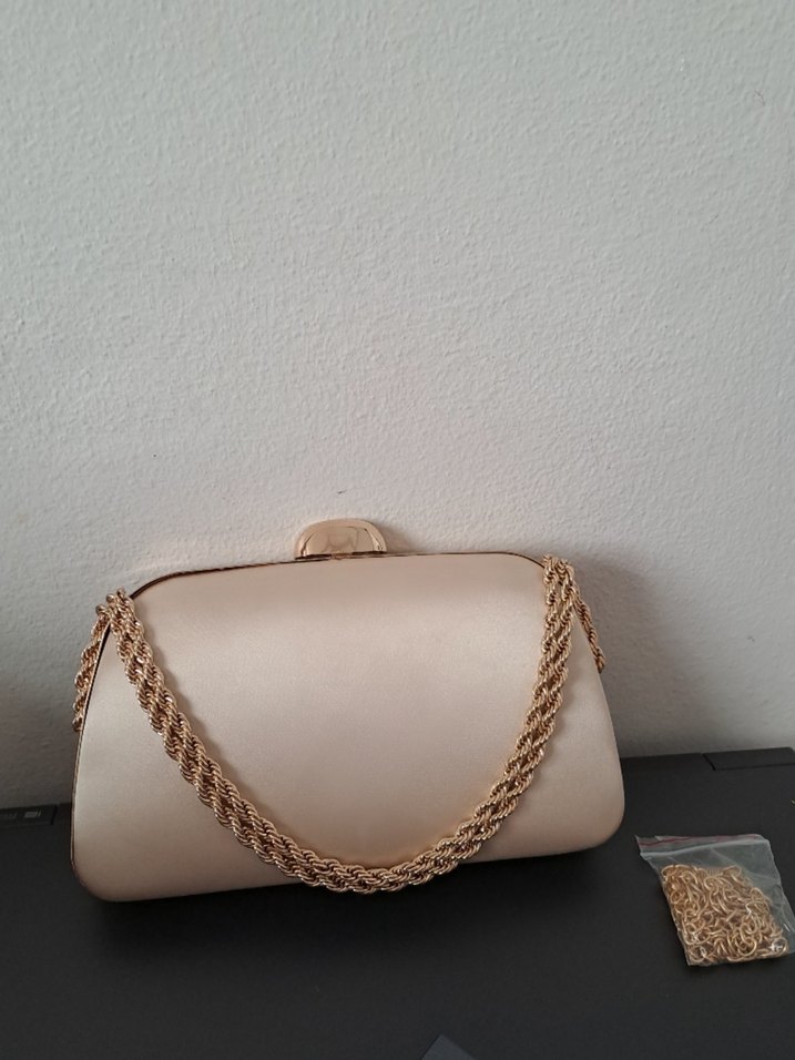 Bej renkte, zincir detaylı ve ipeksi dokulu kadın portföy çanta. Düğün ve klasik tarzlar için uygundur, modern klasik tasarımı vardır. abiye elbiselere de uygundur 1 kez kullandım altin detayli zinciri yanında. marka temsili , tyden almistim