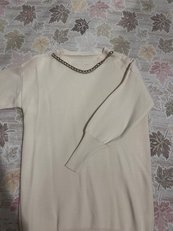 Bej renkli, yuvarlak yakalı ve uzun kollu triko. Yaka kısmında zincir detayı bulunur. Salaş kesim ve midi boydadır, günlük rahat kullanıma uygundur. Standart beden hiç giyilmedi