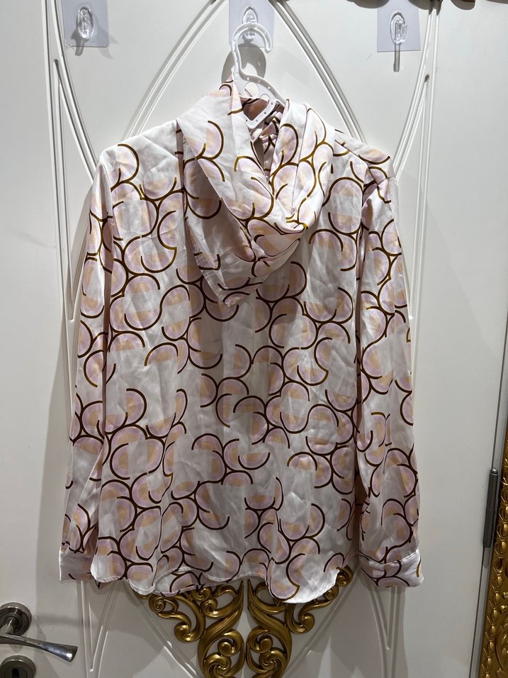 Uzun kollu, yuvarlak yakalı, zincir detaylı ve bağlama desenli hafif bej renkli, salaş kesim kadın gömleği. Günlük kullanım için uygundur. 38-42 beden arası tercih edilebilir Ütülenip gönderim sağlanacaktır
