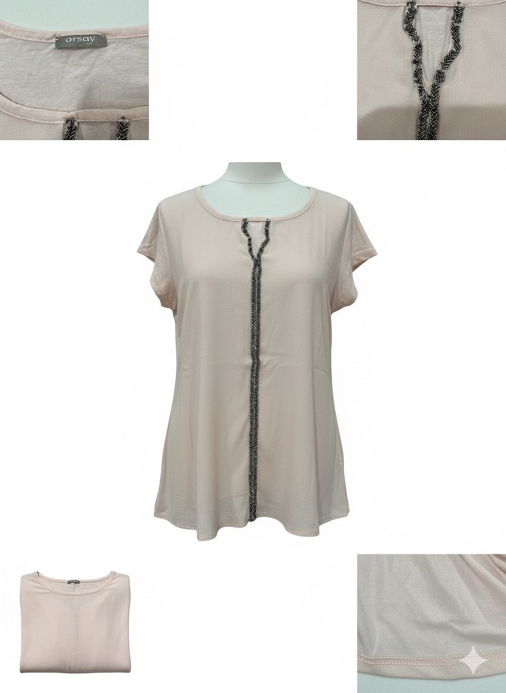 Bej renkli, kısa kollu ve yuvarlak yakalı kadın bluzu. Gevşek kesimi ve zincir işlemeli detayları vardır. Yumuşak sentetik kumaştan üretilmiştir.