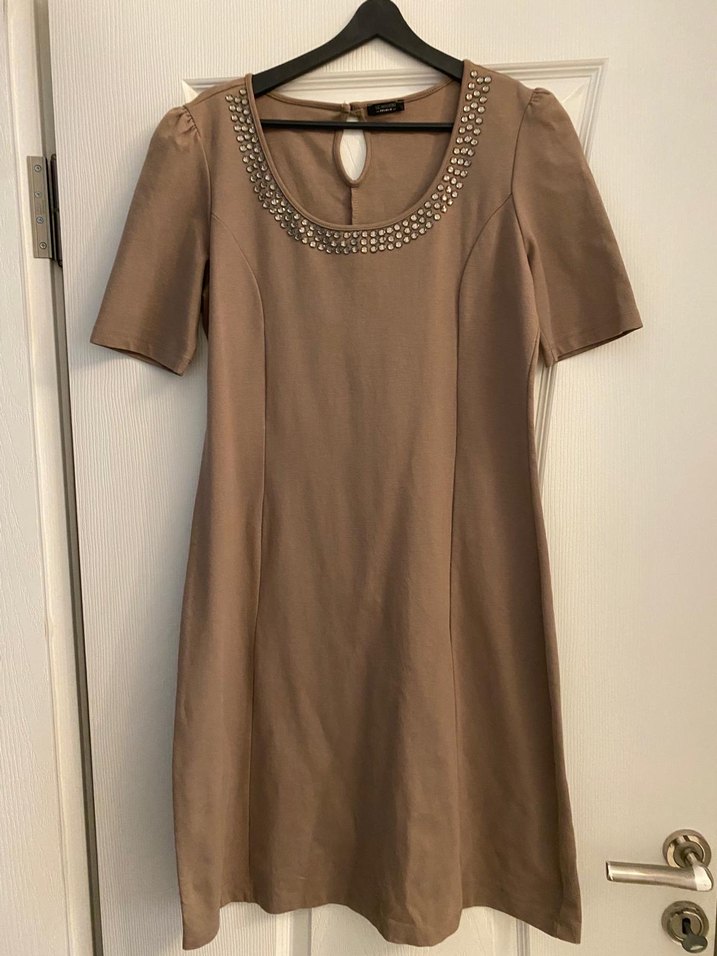 Bej renkli, zincir detaylı yuvarlak yakalı, kısa kollu ve beli oturan midi elbise. İpeksi kumaştan, parlak görünümlü, ofis için uygun. ✨