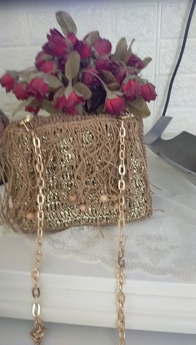 Bej renkli, zincir detaylı ve nakışlı örgü kadın çantasıdır. Parlak yüzeyi ve bohem tarzıyla dikkat çeker. tamamı el yapımıdır.citcitli ve 3 tane gözü vardır