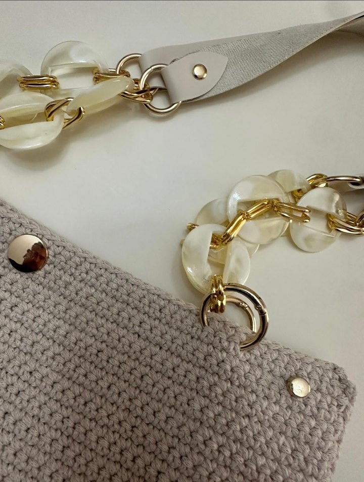Bej renkli, örgü kumaştan yapılmış, zincir detaylı kadın çantasıdır. Bohem tarzıyla günlük kullanıma uygundur.