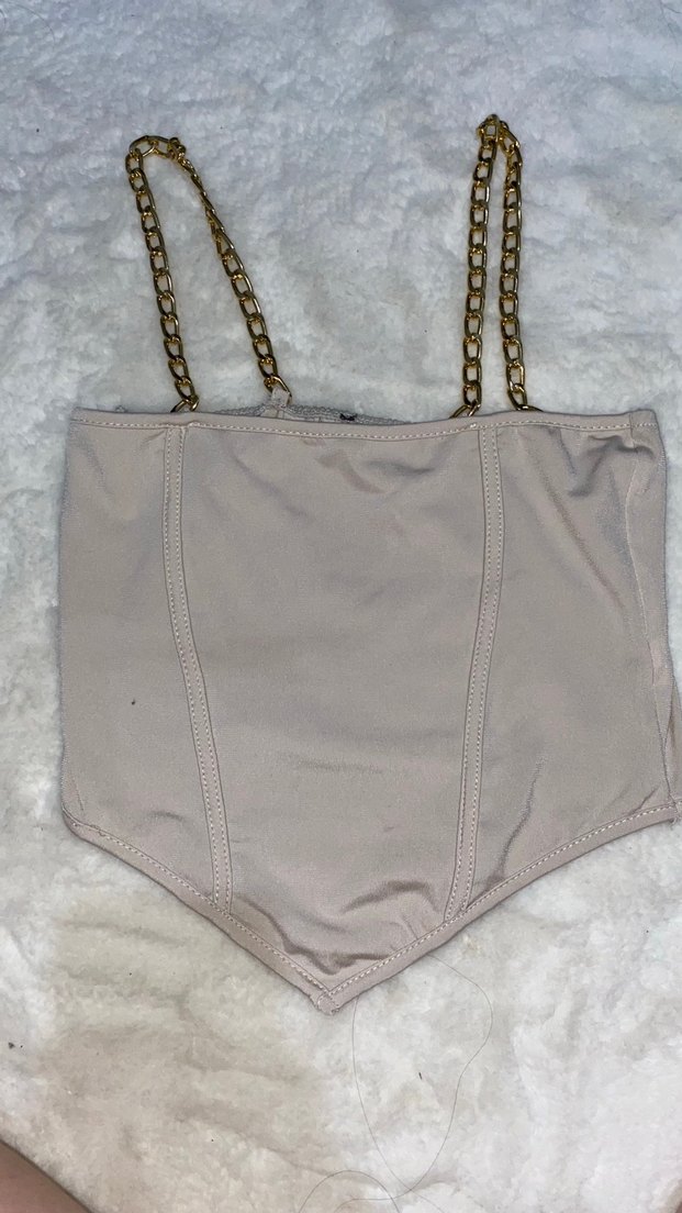 Fitilli, straplez yakalı ve zincir askılı bej büstiyer. Yumuşak sentetik kumaştan, pastel tonlu ve midi uzunlukta, gündelik sokak tarzına uygun.