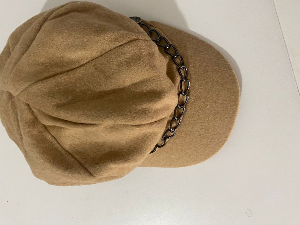 Bej süet malzemeden yapılmış, zincir detaylı kadın şapkası, rahat dokusu ve sokak stiliyle trend bir görünüm sunar.
