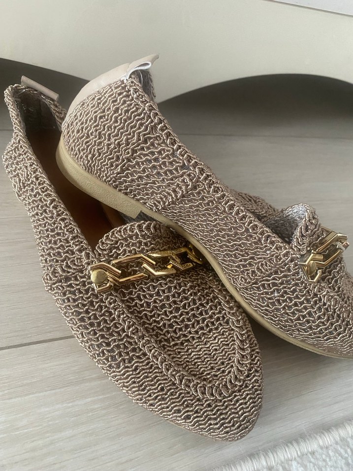 Blok topuklu, yılan desenli bej triko espadriller, altın zincir detayıyla rahat ve şık bir görünüm sunar.