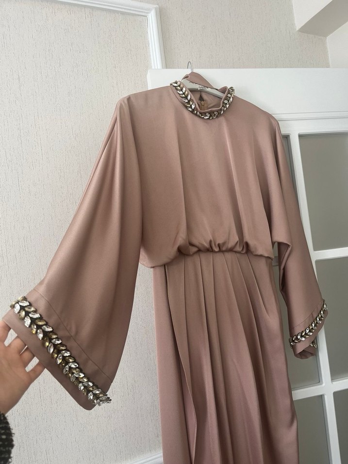 Bej uzun abiye elbise, yüksek yakalı ve bol kesimdir. Yakada ve kollarda taş detayları bulunur. Parlak kumaşı modern klasik bir hava katar. ✨ 36 38 40 beden uyumludur
