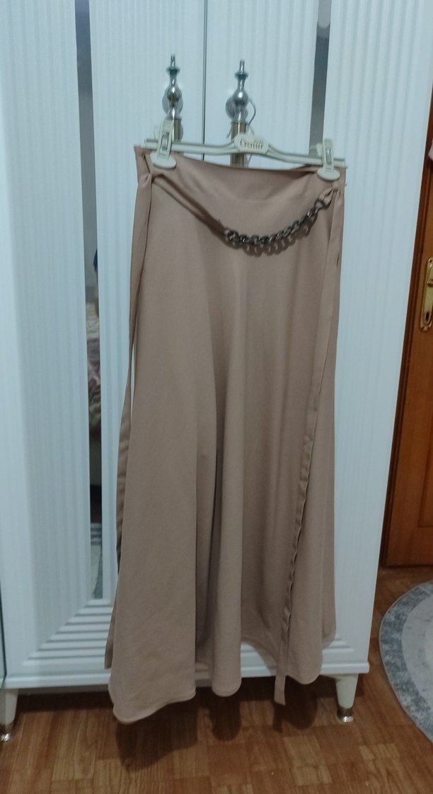 Zincir Detaylı Bej Uzun Etek