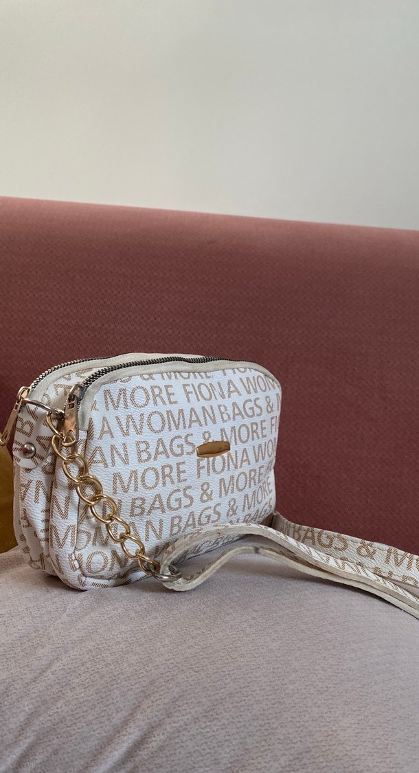 Beyaz renkte, baskılı marka yazılı, zincir detaylı askıya sahip sentetik kumaştan modern klasik tarzda kadın çantası. Günlük kullanıma uygundur.
