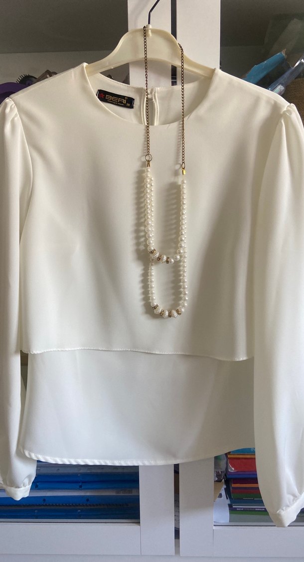 Uzun kollu, yuvarlak yakalı beyaz bluz, zincir detaylı. İpek gibi yumuşak kumaştan, normal kesim ve midi boyda, günlük kullanıma uygun. Etek üstü yandan fermuarlı aynı zamanda arkasında da düğme detayı var.