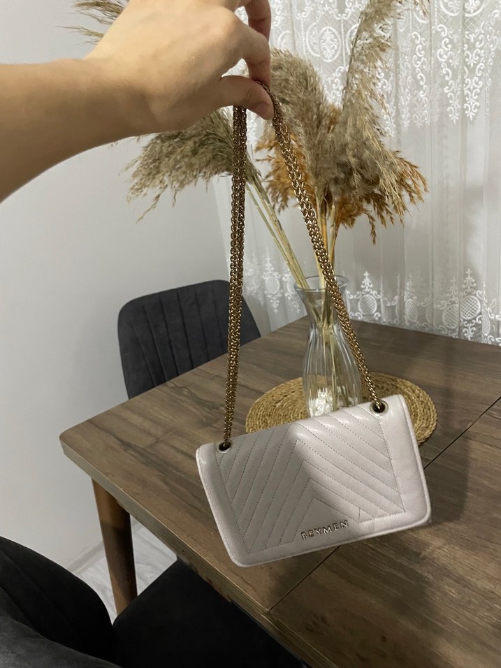 Beyaz renkli, zincir detaylı ve baskılı sentetik kumaştan yapılmış kadın çantası. Paris tarzı ve bohem stilini günlük kullanıma uygun şekilde birleştirir.