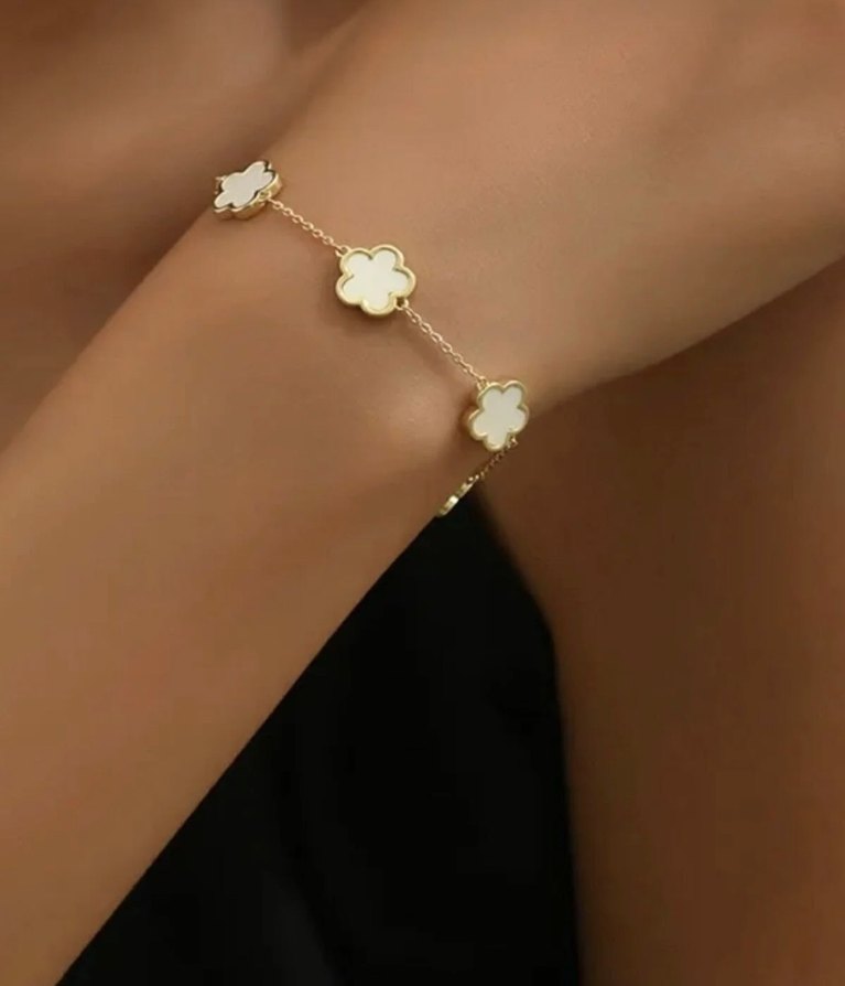 Kadın bileklik, zincir detaylı ve beyaz çiçek desenlidir. Minimalist ve çağdaş tarzı günlük kullanıma uygundur.